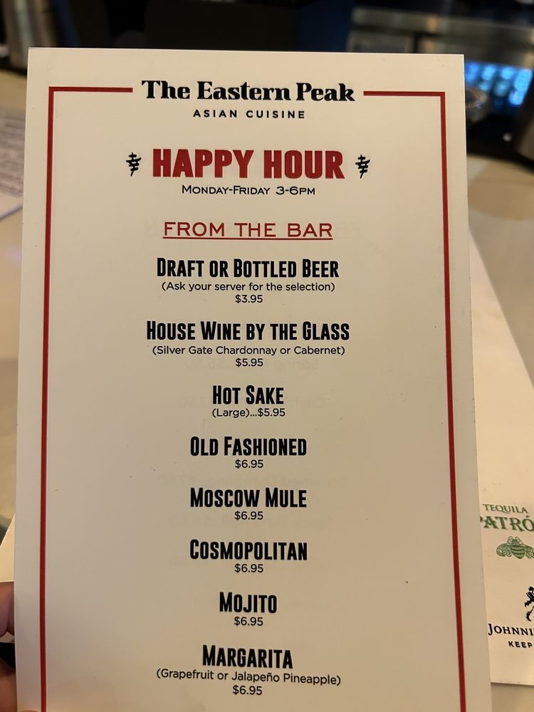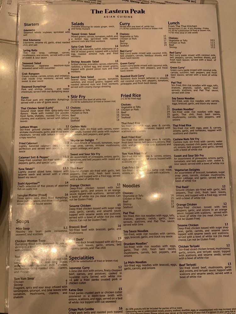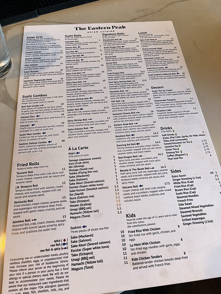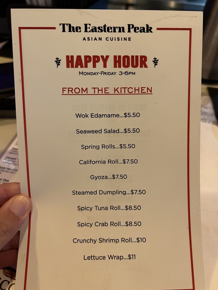 Introducing the menu at The Eastern Peak, a Thai-Asian fusion and sushi bar in Nashville, TN. This trendy yet intimate spot offers a range of vegan and vegetarian options alongside traditional dishes. Customers rave about the 5 Spice Chinese Old Fashioned, fresh sushi rolls like TNT and Red Dragon, and flavorful pad Thai. The restaurant's clean and welcoming atmosphere, coupled with attentive service and a diverse menu, make it a go-to spot for both locals and visitors. Standout dishes include the basil chicken fried rice, Wok edamame, and chicken teriyaki. Whether you're in the mood for a quick lunch or a relaxed dinner, The Eastern Peak delivers on taste and ambiance. Don't miss out on their happy hour specials and extensive drink selection to complement your meal. With a solid reputation for quality and consistency, this restaurant is a must-visit for anyone craving delicious Asian cuisine in a laid-back setting.